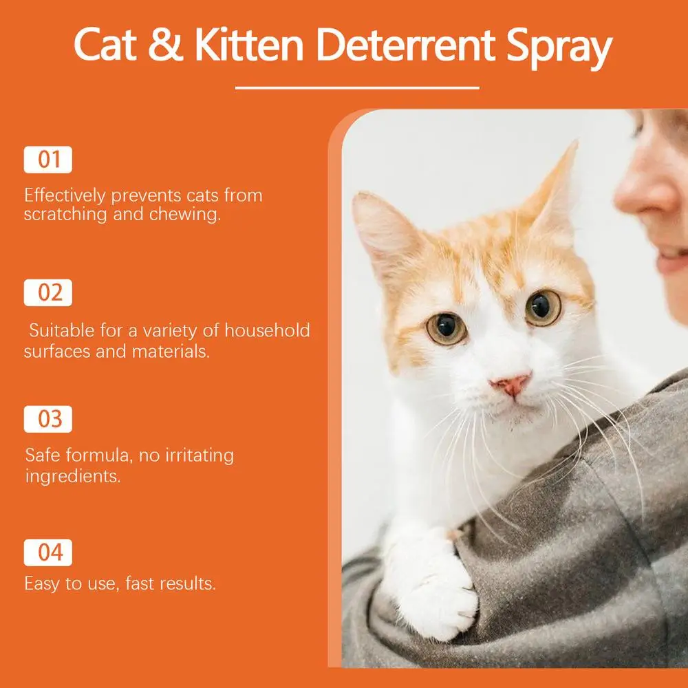 1.Keep Cats off Furniture: This cat scratch spray's natural bitter ingredients effectively stop cats from scratching and chewing furniture, shoes, clothes, indoor plants, and other items. Just spray and protect your property from damage